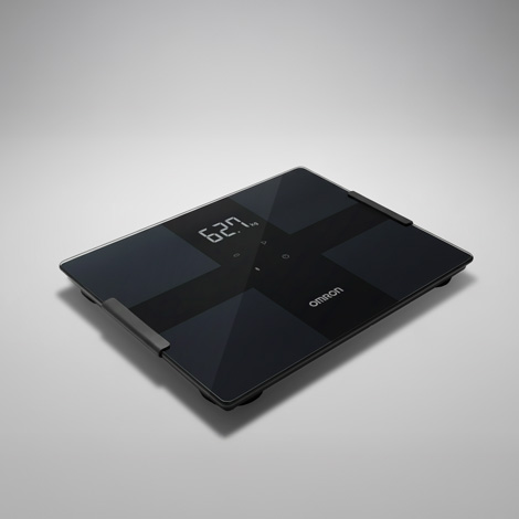 アプリ連携機能を備えた体重体組成計。生活空間に馴染む洗練された佇まいと、計測機器としての精度の高さを表現したデザインです。
